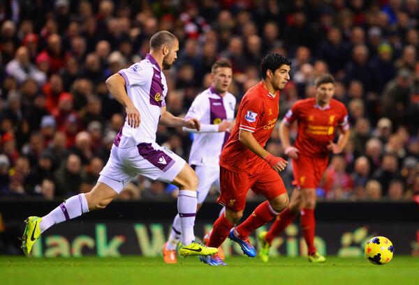 Con el minuto 45 cumplido, segundos antes del pitido final del primer tiempo, Sturridge marcó un gol psicológico para los locales. El internacional inglés definió una jugada colectiva que había iniciado Suárez y logró extender cierto optimismo en Anfield antes del descanso. El partido parecía tomar definitivamente un nuevo cariz cuando en el minuto siete de la segunda parte el árbitro señaló un controvertido penalti a favor de los locales que se encargó de convertir el capitán Steven Gerrard. Suárez se internó en el área con el balón controlado y se abrió hacia la izquierda ante la salida del portero, que alargó la mano cuando el delantero se había quedado casi sin ángulo y rozó aparentemente el pie del astro uruguayo, que se fue al suelo.